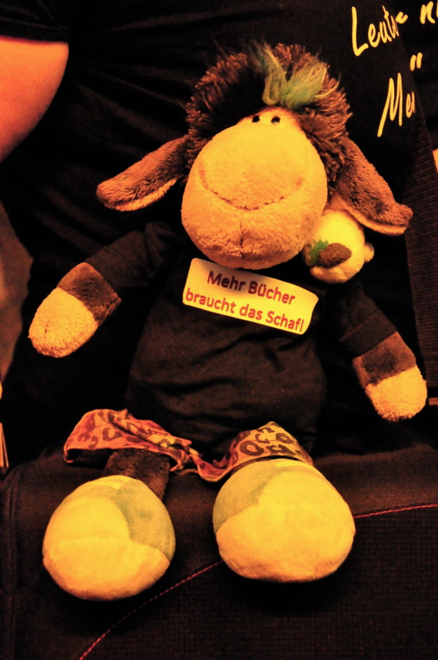 Nachdem alle mit Sekt abgefüllt waren, gab es eine einstündige Mini-Ausgabe der hiesigen Lesebühne Vision & Wahn. Marry las …